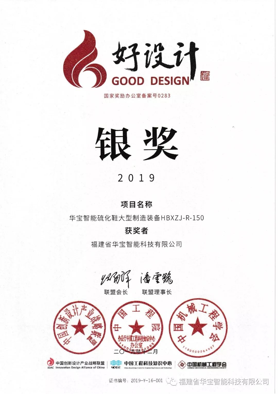在“中國好設計”合作伙伴——“裝備中國”2019年高端設備創新設計大賽中,華寶科技以“華寶智能硫化鞋大型制造裝備HBXZJ-R-150”項目脫穎而出,獲得本次大賽的銀獎,并受邀參加頒獎典禮。
